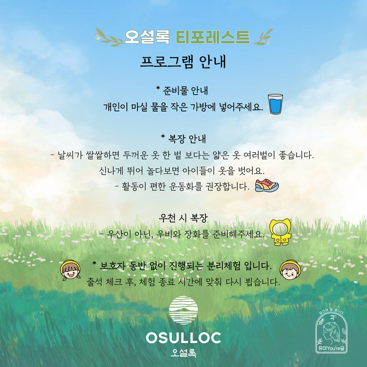 - 우천시 복장 : 우산이 아닌, 우비와 장화를 준비해주세요.